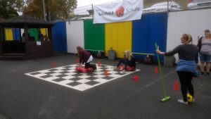 Nach der Übergabe wurde der Schulhof in ein großes Festgelände verwandelt und mit sehr viel Spaß gefeiert. Die Schüler und ihre Eltern, Großeltern und Geschwister konnten die kreativen Angebote vieler Stationen nutzen. Wer mindestens fünf Stationen geschafft hatte, durfte das Glücksrad drehen und konnte tolle Preise gewinnen.