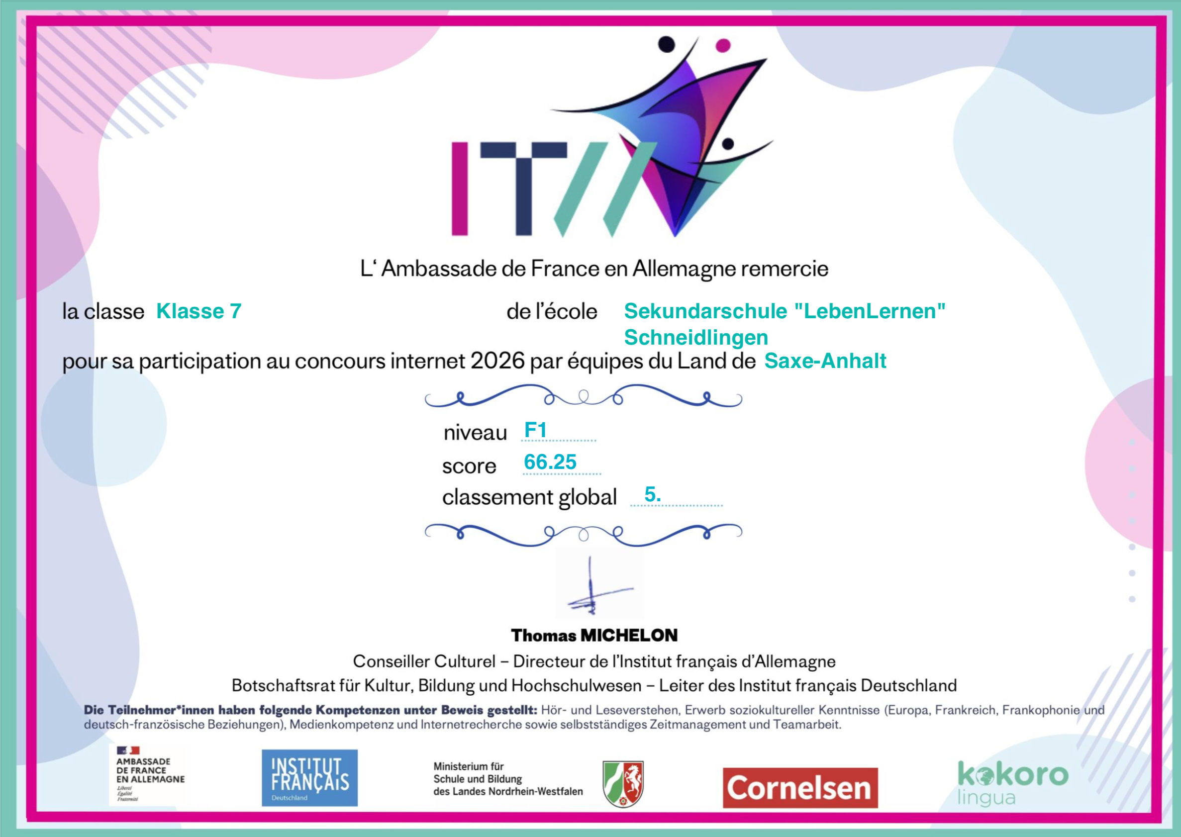 2. Wir freuen uns mitteilen zu können, dass unsere SuS Leon Dufraine,Lana Krüger und Stella D´Agostino, am 19.03.2025 die Plätze 6-8 bei der Englischolympiade des Salzlandkreises belegt haben und Leon am gleichen Abend von den Wirtschaftsjunioren ausgezeichnet werden konnte.