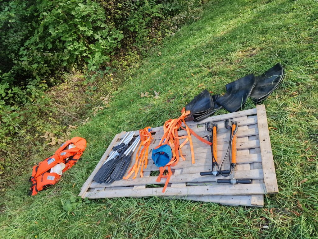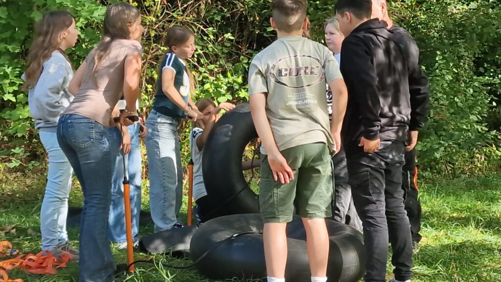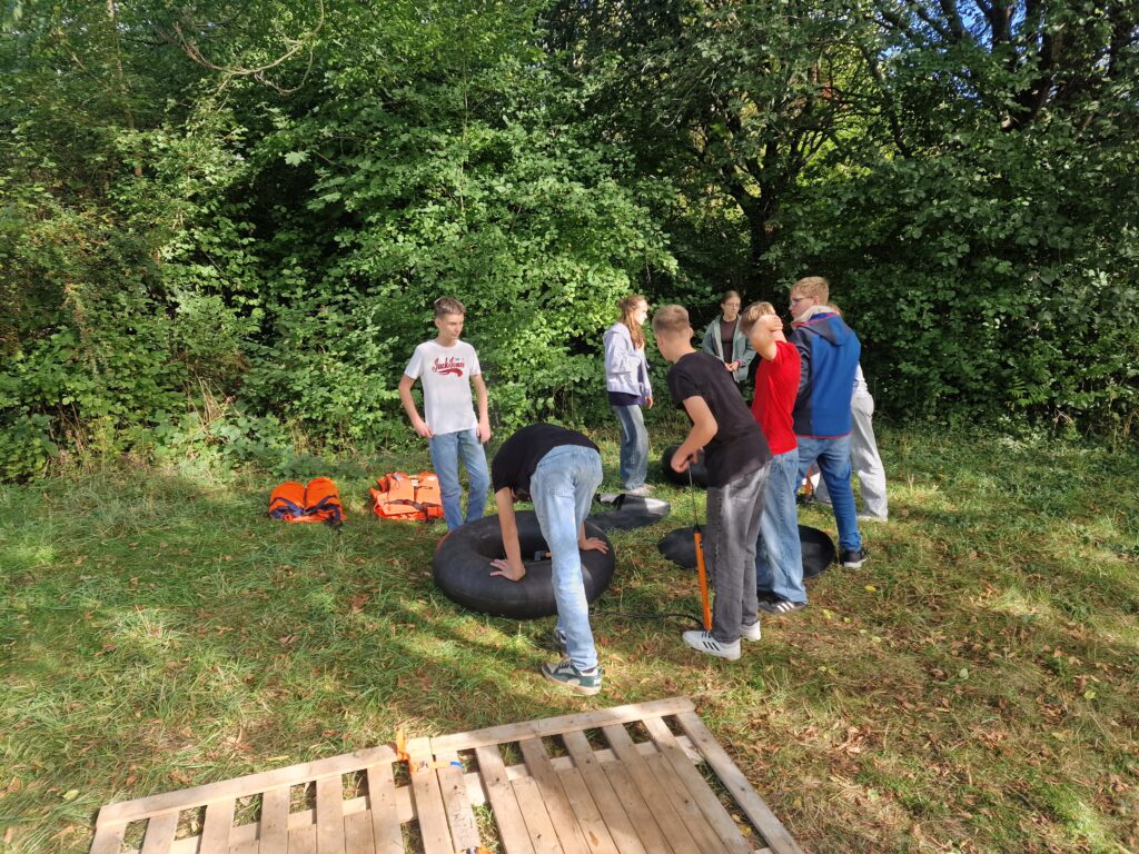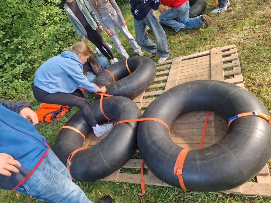 Die Schüler wurden in zwei Teams eingeteilt und erhielten die Aufgabe, aus Paletten, Gummireifen und Spanngurten jeweils ein eigenes Floß zu bauen. Mit viel Kreativität, Teamgeist und handwerklichem Geschick entstanden zwei schwimmfähige Konstruktionen.
