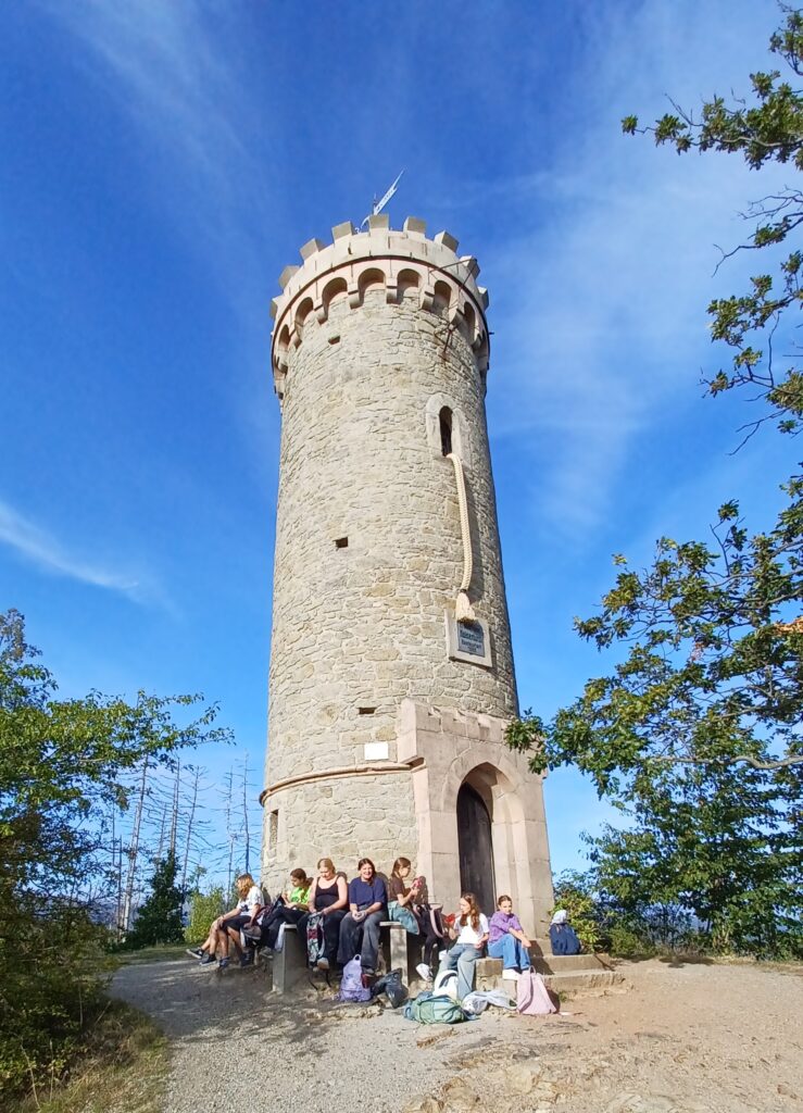 Die erste Etappe führte durch den Wald bis zum Rapunzelturm (Bismarckturm). Dort legte die Klasse eine Stärkungspause ein und bearbeitete in Kleingruppen einen themenspezifischen Fragebogen.
